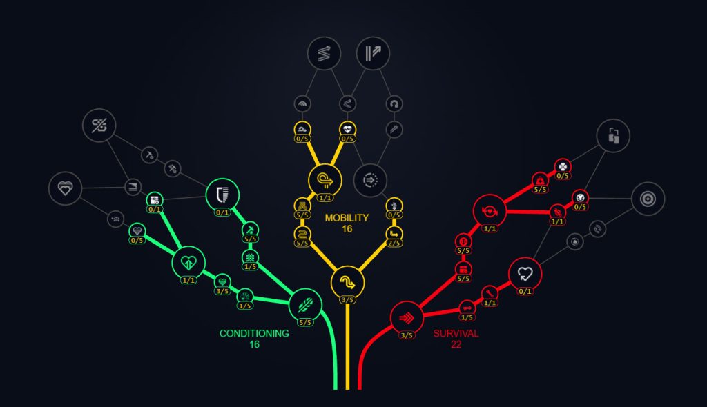 Conditioning is your survivability tree. Weight management, noise reduction, melee damage—basically everything that helps you not die when things go sideways. It’s useful, but most of it becomes more valuable later in your progression.